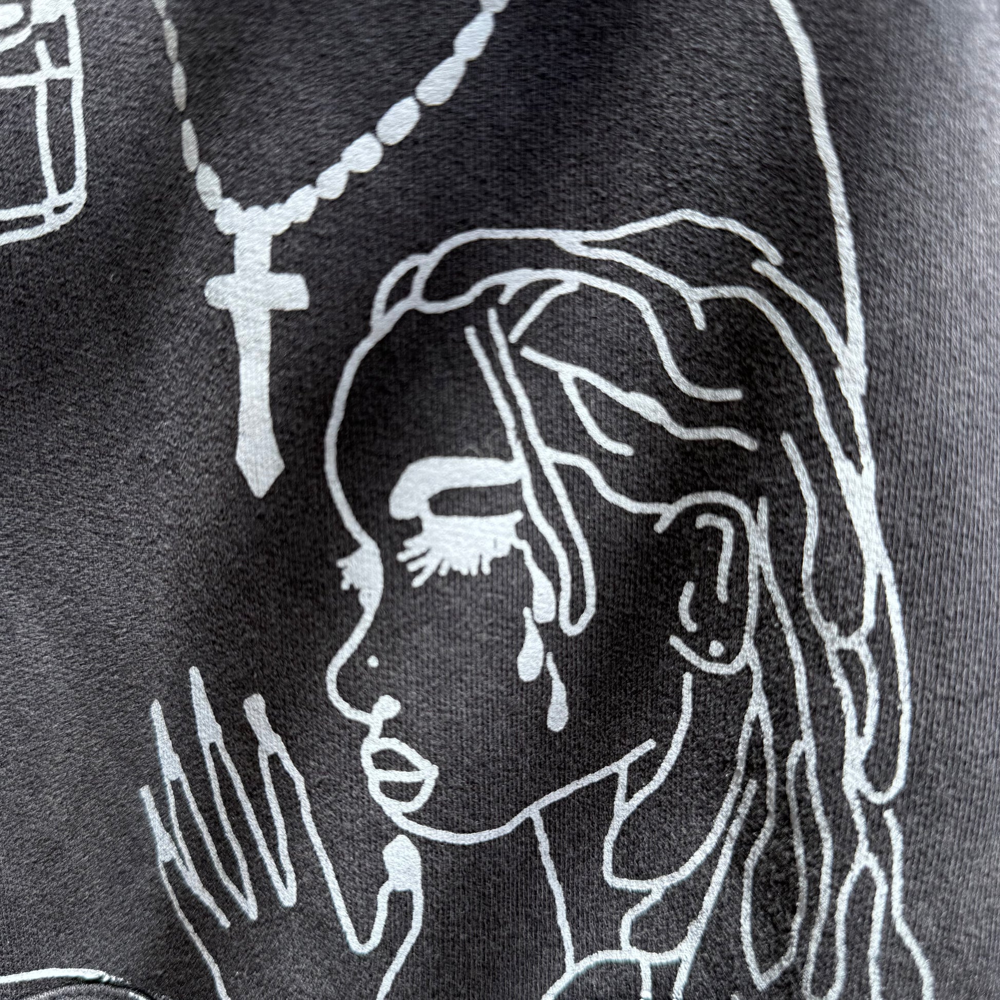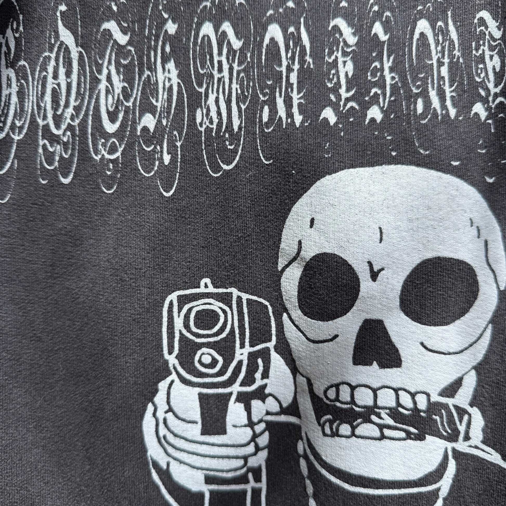 Vintage fabric hoodie with “gothmafiafamily” across chest and hand drawn skeleton